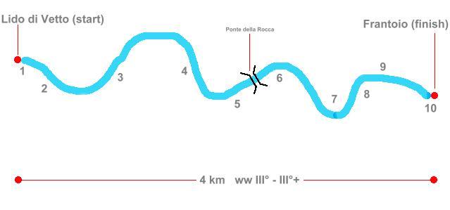 Su questo tratto di fiume si sono disputate le ultime edizioni delle gare internazionali di canoa discesa. E' un tratto molto divertente anche se non particolarmente impegnativo, caratterizzato dall'alternanza di brevi rapide con laghetti tranquilli ideali per il gioco. Molto invitante la rapida finale, lunga oltre mezzo km, con divertenti giochi d'acqua. Il tempo necessario è di circa un'ora. Lo sbarco è al frantoio della cantoniera. |